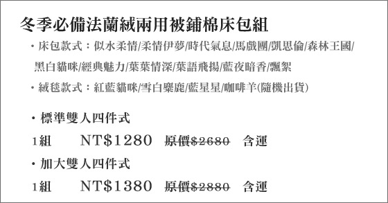 商品訊息簡述: 只要1280元起(含運)即可購得原價最高2880元冬季必備法蘭絨兩用被鋪棉床包組:(A)標準雙人孕韟?(B)加大雙人孕韟﹛A皆有多款可選。購買再加贈輕柔保暖法蘭絨毯(款式隨機出貨)。
