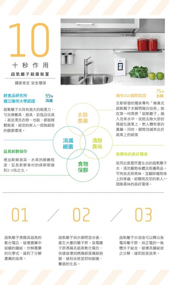 首先將主機懸掛,並固定在牆壁適當位置,接著將高科技專利超氧離子混合器,接上水龍頭並連接矽膠軟管,再接上電源即完成安裝。打開水龍頭,即可使用,生活中在洗滌上隨時都可用。