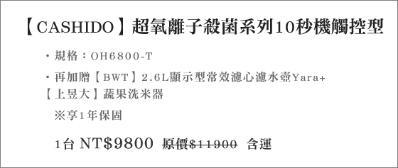 只要9800元(含運)即可購得【CASHIDO】原價11900元超氧離子殺菌系列10秒機觸控型(OH6800-T)1台,再加贈【BWT】2.6L顯示型常效濾心濾水壺Yara+【上昱大】蔬果洗米器。