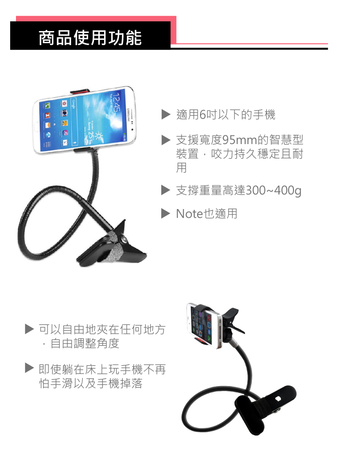 長時間使用手機的必備蛇管支架,讓您可更輕鬆省力觀看手機,也避免姿勢不良造成的身體痠痛困擾。